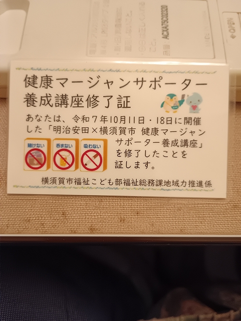 10月18日 田浦町の麻雀仲間と共に、「日本健康麻雀協会」(私が8月に指導員の資格を取った団体とは、また別の団体)主催の「麻雀指導員養成講座」を受けて来ました。(添付写真はその受講修了証です。)(これで2つの団体から、麻雀指導員の資格を得ることが出来ました。)今回は、2日間(10/11,18)の研修で、麻雀の指導員を養成する講座です。横須賀市役所が主催しており、これから健康麻雀を横須賀市民の年配者に広める為の指導員を養成しようと言う研修講座です。