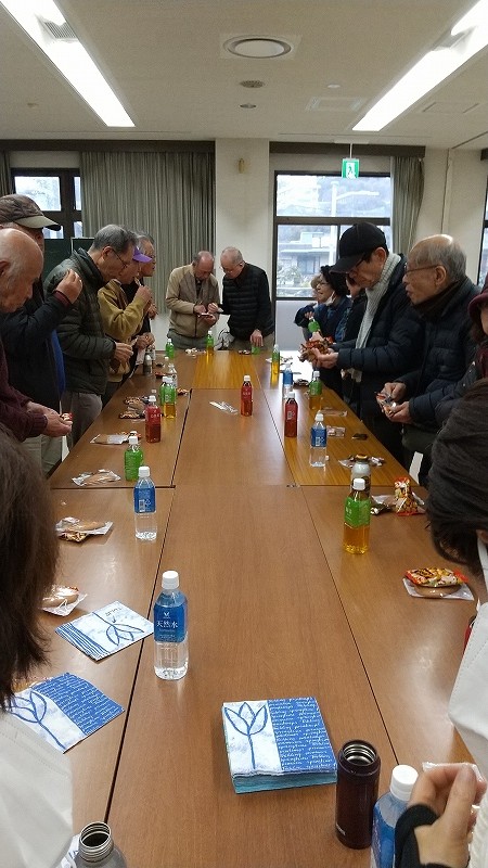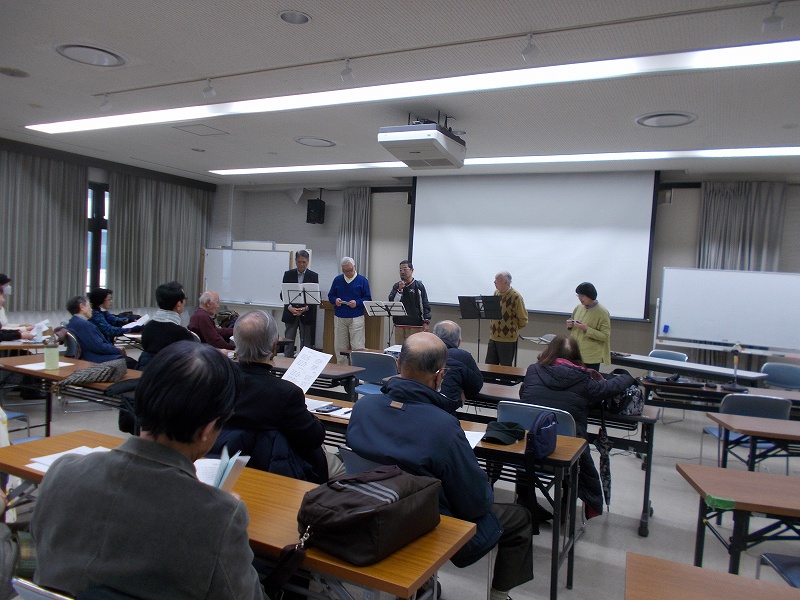 総会の後、一応最後となるハーモニカ伴奏による合唱を全員で行った後、節目となる全員集会ということで簡単な茶話会を催し、解散しました。